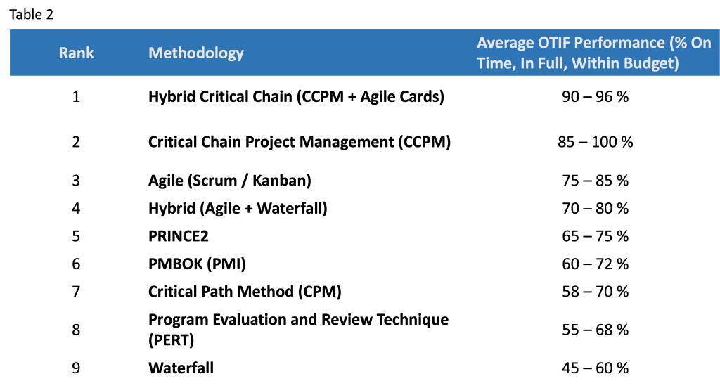 This paper examines the comparative performance of major project management methodologies through the lens of On-Time, In-Full (OTIF) delivery within budget, a key performance indicator of organizational reliability and cash flow stability. Drawing from over 20 industry benchmarks, case studies, and empirical data from Exepron’s Critical Chain Project Management (CCPM) implementations, the study finds that Hybrid Critical Chain—which combines CCPM’s constraint-based scheduling with Agile task-level execution—achieves the highest proven reliability. OTIF performance rates of 90–100 % demonstrate significant improvement over traditional deterministic methods such as Waterfall, CPM, and PERT, as well as iterative methods like Agile and PRINCE2. The analysis concludes that predictable, on-budget delivery and shorter lead times are not outcomes of individual task efficiency but of systemic synchronization, real-time buffer management, and responsive execution.